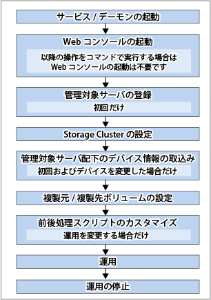 Storage Clusterコンティニュアスコピー機能を利用する場合のレプリケーション運用の流れを以下に記述します。
