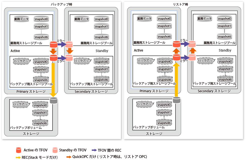 | 3 | AdvancedCopy Managerでバックアップ用ストレージプール配下のデバイスから、業務用ストレージプール配下のデバイスへリストアします。 | 業務サーバまたはバックアップサーバ |