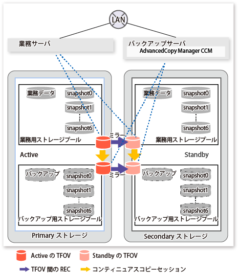 Storage Clusterコンティニュアスコピー機能を利用したAdvancedCopy Manager CCM運用の構成例を以下に示します。