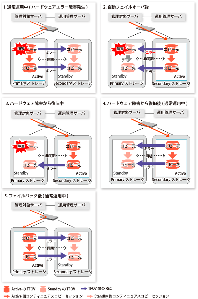 図8.13 TFOステータスが"Active"のPrimaryストレージにハードウェア障害が発生して自動フェイルオーバーする場合