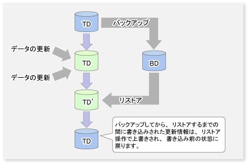 最新のバックアップボリューム採取時点からリストア操作を行うまでに、業務ボリュームの内容を書き換えたとしても、書き換えられたデータは保証されません。