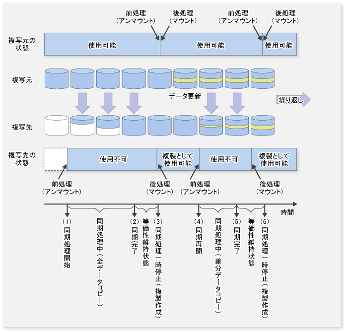 ファイルシステムの前後処理とは、ファイルシステムのアンマウント/マウント処理です。複製元ボリュームに対する前後処理は、複製元データを保証するためのものです。複製先ボリュームに対する前後処理は、同期処理実行中やスナップショットコピー時に他プロセスがアクセスできないようにするためのものです。ボリュームがマウントされていない場合は、前後処理が実施されません。