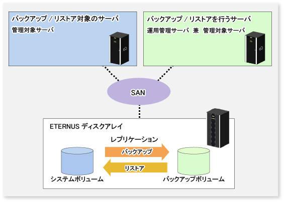 システムボリュームをETERNUS ディスクアレイに配置したSANブート環境では、レプリケーション機能を利用したシステムボリュームのバックアップ/リストアが可能です。