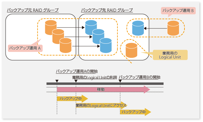 以下の例は、同時に3つのLogical Unitをまとめてバックアップする運用です(バックアップ運用A)。バックアップ先RAIDグループには、バックアップ運用AのLogical Unit以外のLogical Unitが存在しないため、バックアップを実施する以外の時間は、ディスクドライブを停止できます。
