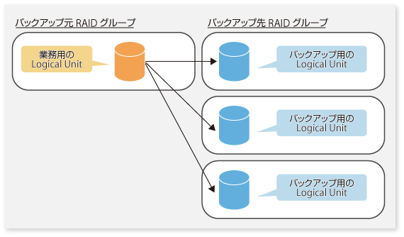 バックアップ対象とするデータを格納するためのRAIDグループ(以下、“バックアップ元RAIDグループ”)とバックアップデータを格納するためのRAIDグループ(以下、“バックアップ先RAIDグループ”)を作成します。また、それぞれのRAIDグループにLogical Unitを割り当てます。