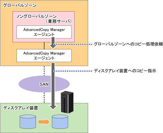 Oracle Solarisゾーンサポート機能は、グローバルゾーンのAdvancedCopy Managerエージェントを経由して、ノングローバルゾーンの業務と連携したバックアップ/リストアを行います。
