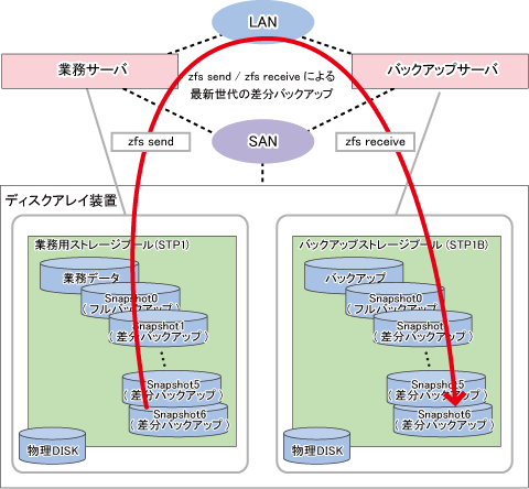 ZFSスナップショットとzfs send/zfs receiveコマンドを組み合わせて、バックアップします。業務などへの影響を考慮し、定期的(例えば、日単位)の差分バックアップと、一定周期(週単位や月単位)のフルバックアップを組み合わせて実施する運用を推奨します。