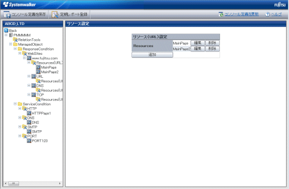 リソースID | 通常、URL1のみURLを設定してください。 しかし、以下の例のように、異なるURLでも同一のWebページを指す場合があります。 例) http://www.fujitsu.com/SQC/ http://www.fujitsu.com/SQC/index.html これらの2つのURLを、1つのWebページとして合算し、参照したい場合にURL1に加え、URL2を使用し、以下のように設定をします。 URL1 : /SQC/ URL2 : /SQC/index.html 半角英数字、半角記号(ただし$\"'[]<>=&^|{}()#*;?,以外)が使用できます。長さの制限は、64文字以内です。 半角記号'_'および'%'は、任意の1文字として扱います。 | |
