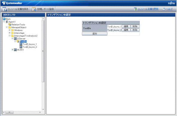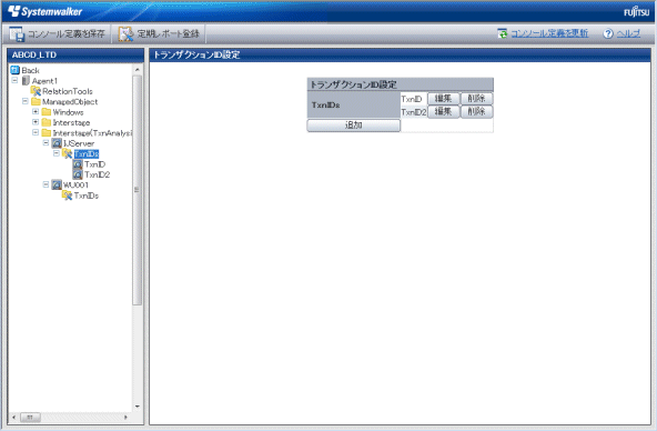 本製品の詳細表示で、Interstage(TxnAnalysis)JavaEE/Interstage(TxnAnalysis)ノードから、トランザクション内訳分析表示を行う際、特定のトランザクションIDにて絞り込んだコンテンツの表示を行う場合に定義します。