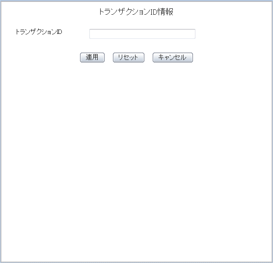 TxnIDs | トランザクションID | トランザクションID には、詳細表示画面のTransactionID_mapから、トランザクションのコンテキストID/コリレーションID に対応したTranaction IDを参照し、設定します。 半角記号'_'および'%'は、任意の1文字として扱います。 |