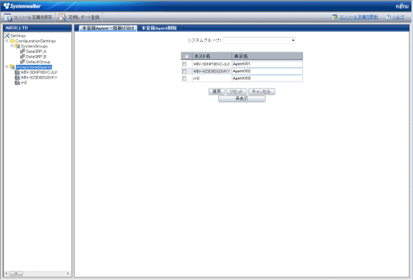定義画面ツリーで、UnregisteredAgentsツリーをクリックすると、[未登録Agent一括振り分け]画面が表示されます。
