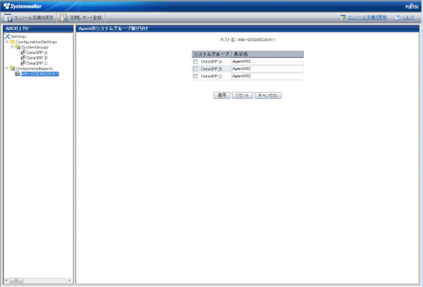 定義画面ツリーで、UnregisteredAgentsツリー配下に表示されているAgentをクリックすると、[Agentのシステムグループ振り分け]画面が表示されます。