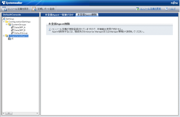 コンソール定義が複数定義されている環境において、[未登録Agent削除]タブをクリックすると、本機能が使用できないことを示す画面が表示されます。