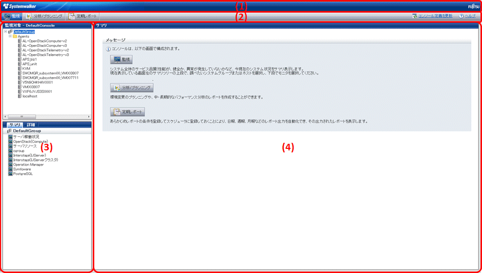 | (1) | グローバルヘッダー | SystemwalkerとFujitsuのロゴが表示されます。 |