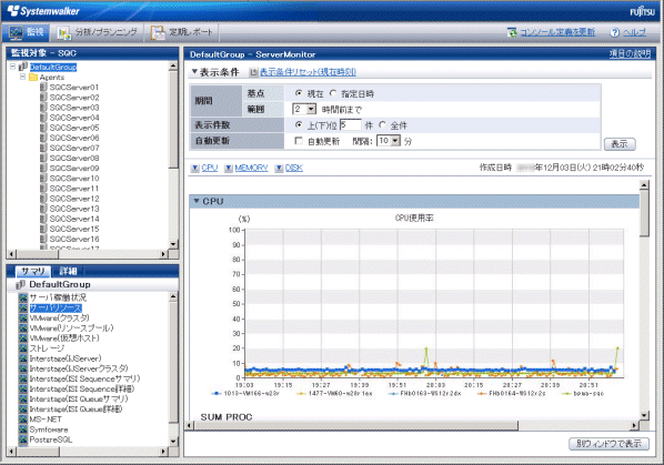 左側のサマリツリーで表示対象のモニタを示すノードを選択することで、右側にモニタコンテンツが表示されます。