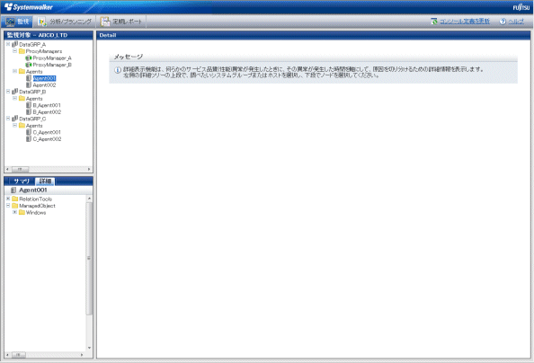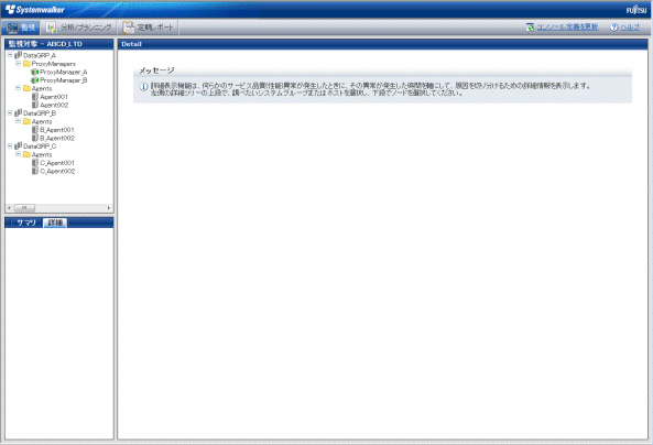 | type | 表示対象の種類および名前(表示名)を指定します。 当パラメーターは2つをセットで指定します。 指定可能な種類は以下のいずれかになります。 "SystemGroup" "ProxyManager" "Agent" ポイント nameには、一部の記号文字(例.#?+\$" など)は、直接URLには指定できません。指定を行いたい場合は、URLエンコードを行って指定してください。 注意 typeに "SystemGroup"、"ProxyManager"、または "Agent" を指定した場合で、nameに指定した表示名の対象が存在しないと、呼び出したコンソールのサマリツリー下段に、以下のメッセージが表示されます。 |