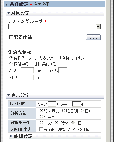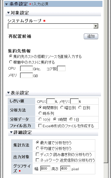 | 集約先情報 | 集約先ホストの搭載リソースを直接入力する/稼働中のホストに集約する | 集約先ホストがすでに該当のシステムグループに登録されている場合は、[集約先ホストを指定する]を選択します。 指定したホストのCPUとメモリの搭載量が、表示されたグラフ内に黒い線で表示されます。 登録されていない場合は、[ホストの搭載リソースを直接入力する]を選択します。 |