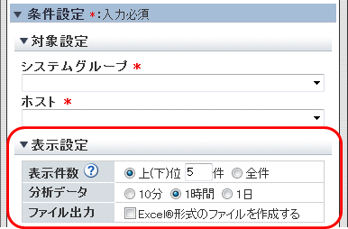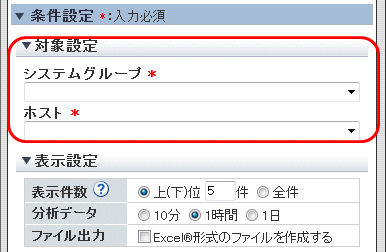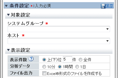 | ホスト | 分析の対象とするホストを、プルダウンメニューより選択します。 ホストには、選択されたシステムグループに登録されたホストの選択肢が表示されます。 |