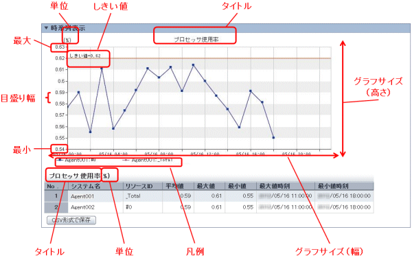 | 単位 | グラフのY軸の単位を指定します。 指定した場合のイメージは、下図「詳細設定を行って表示したグラフ(例)」を参考にしてください。 単位には、Shift-JISコードの以下の文字が使用できます。