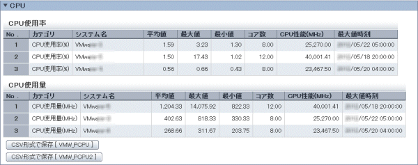 仮想ホストごとのリソース割り当て量とリソース使用量が一覧で表示されます。
