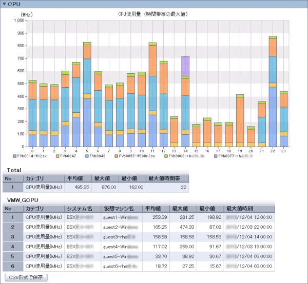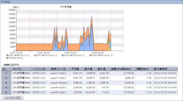 仮想ホスト内の仮想マシンのリソース使用情報が積み上げグラフで表示されます。