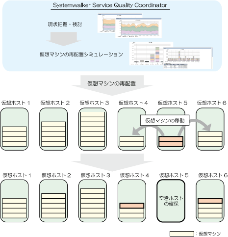 Systemwalker Service Quality Coordinatorを利用して、別のホストからオーバーコミット運用のホストへ仮想マシンを移動した場合のリソース使用状況を、事前にシミュレーションすることができます。このシミュレーション結果をもとに仮想マシンを移動させ、空きホストを確保します。