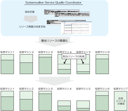 Systemwalker Service Quality Coordinatorを利用して、リソース使用率の低い仮想マシンを検出します。検出結果をもとに割り当てリソース量を見直し、空きリソースを確保してリソースの最適化を図ることができます。