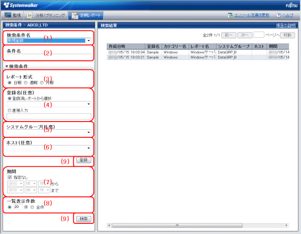 | (7) | 期間 | レポート期間を指定することができます。 検索したい定期レポートの期間が含まれるように指定してください。 例)レポート期間が8月31日から9月6日までの週報を検索する場合は、レポート開始日を8月31日以前、レポート終了日を9月6日以降に設定してください。 |