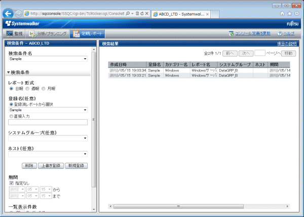 V13.5以前に定期レポート登録し作成されたレポートは、定期レポート一覧表示の[レポート名]の欄に[登録名]が表示されます。V15.0.0以降にアップグレード後に作成されたレポートも、[レポート名]の欄に[登録名]が表示されます。