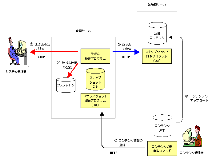 改ざん監視機能は、公開Webコンテンツの改ざんをいち早く検出し、システム管理者へ通知することにより、公開Webサイトのセキュリティ問題から派生する損害(信用失墜、ビジネス機会の損失など)を最小限に抑えることを目的としています。
