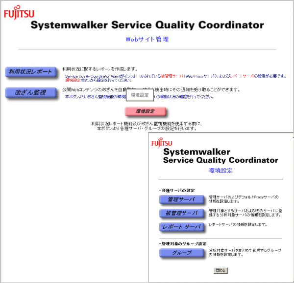 [Webサイト管理]画面の[環境設定]ボタンを押下し、[環境設定]画面を開きます。