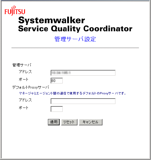Proxyサーバ | ここではチェックしません。 | Systemwalker Service Quality Coordinatorが管理する環境におけるデフォルトのProxyサーバがあれば、以下の項目を設定してください。 アドレス Proxyサーバのホスト名またはIPアドレスを設定してください。 ポート Proxyサーバのポート番号を設定してください。 |