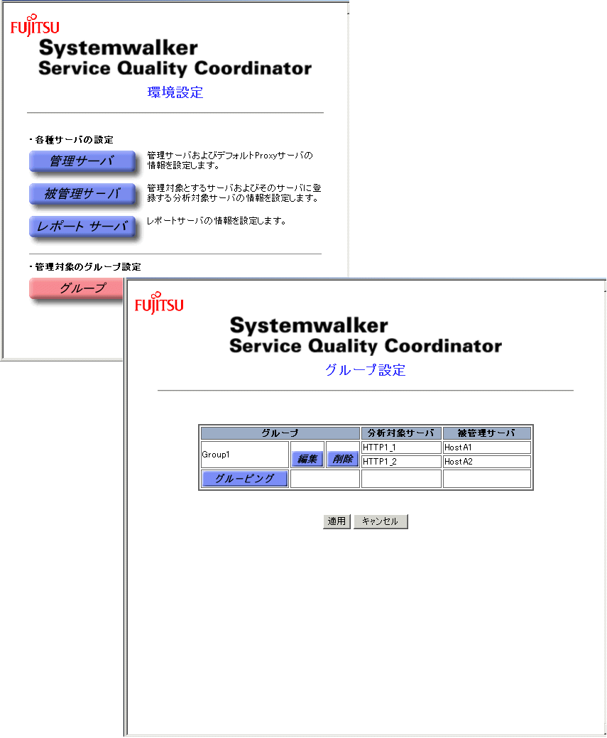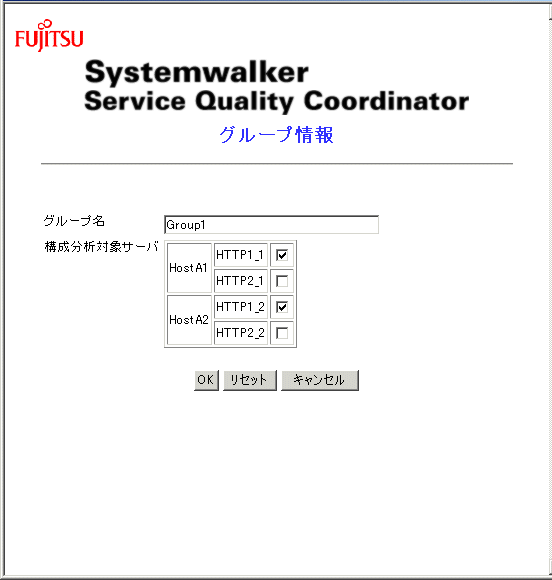 構成分析対象サーバ | HostA1のHTTP1_1とHostA2のHTTP1_2を選択します。 | 当グループを構成する分析対象サーバを、分析対象サーバの一覧リストのチェックボックスをチェックすることにより選択します。 |