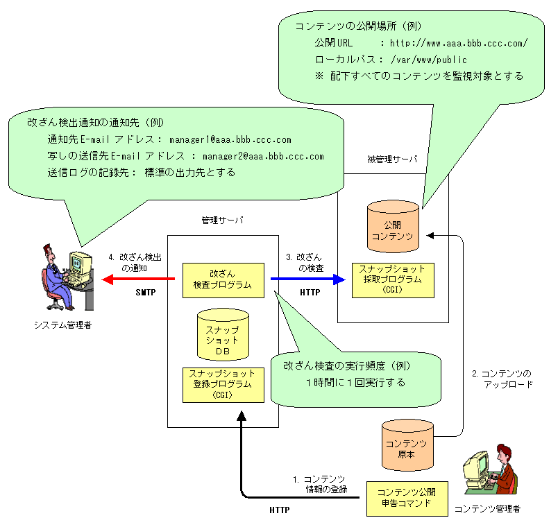 コンテンツ管理者が複数の場合、監視条件をコンテンツ管理者単位に登録すると、改ざん検出通知を適切なところへ無駄なく送信できます。