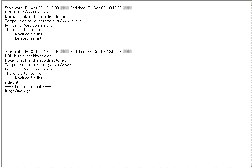 この画面は、改ざん検査の実行状況を確認するための画面です。この画面では、検査結果の累積記録が古い順に表示されます。下図は、ひとつの監視条件に対する実行結果の例です。