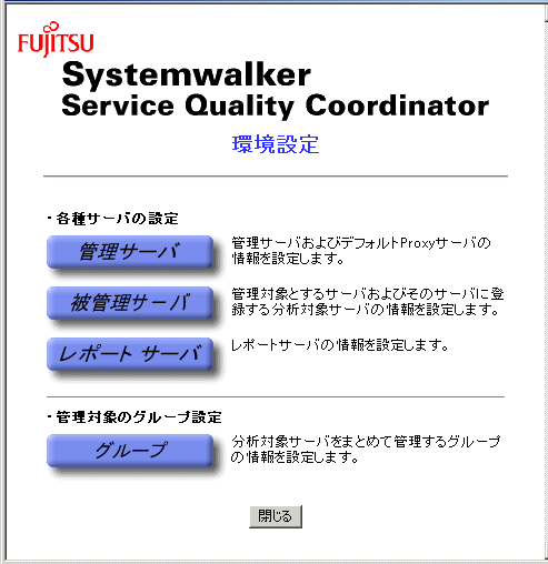 環境設定画面では、各種サーバの設定、被管理サーバのグループ設定を行います。