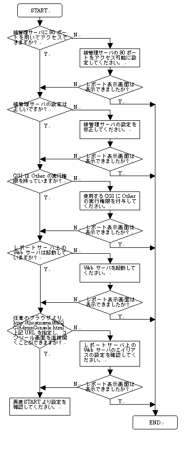 - | 管理サーバよりネットワーク越しにレポートサーバを参照できますか? | ネットワークの設定を見直し、管理サーバよりネットワーク越しにレポートサーバが参照できるようにしてください。 |