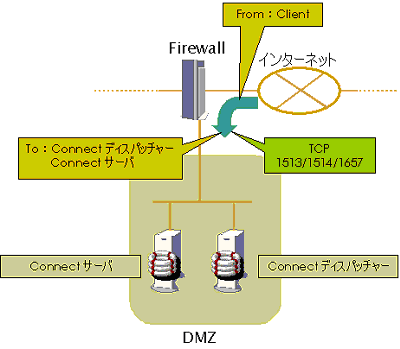 DMZは(インターネットから)内向きの接続を許可しますが、無制限に接続を許可する訳ではなく、ClientコンピュータのIPアドレスからConnectコンピュータのIPアドレスへの接続で、TCPポート 1513/1514/1657のみを許可します。