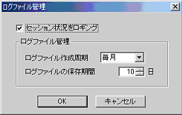 以下のようなダイアログが表示されます。「セッション状況をロギング」にチェックを入れてから、「ログファイル作成周期」および「ログファイルの保存期間」を指定して[OK]を押してください。各項目の詳細は“ロギングの設定項目”を参照してください。
