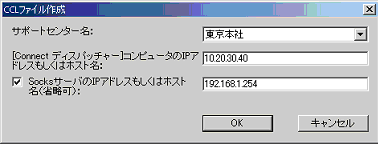 以下のようなダイアログが表示されます。サポートセンター名をドロップダウン・リストから一つ選択して、ConnectディスパッチャーのIPアドレスもしくはホスト名として、グローバルIPアドレスかフルドメインのホスト名を指定してください。SOCKSプロキシ経由で接続する場合は、「SocksサーバのIPアドレスもしくはホスト名」にチェックを入れて、SOCKSサーバのIPアドレスもしくはホスト名を指定してください。各項目の詳細は“CCLファイル作成項目”を参照してください。設定後[OK]を押すと、ファイルの保存ダイアログとなりますので、任意のフォルダに保存してください。デフォルトのファイル名は「SUPTCP.CCL」になります。