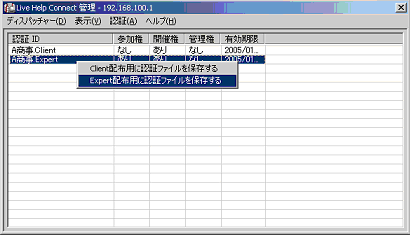 Expert配布用に認証ファイルを保存する | Expert用認証ファイル作成。ファイル名は「EXPERTCR.DAT」。 |