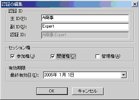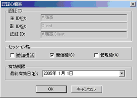 以下のダイアログが表示されます。認証ID(主IDおよび副ID)、セッション権および有効期限を設定して[OK]を押してください。