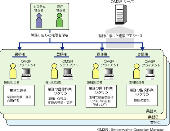 職務に応じて必要最小限の権限を与えられるため、職務担当以外の操作ミスによるトラブルや、職務を越えた行為のトラブルがなくなり、セキュリティ上、より安全に稼働させることができます。