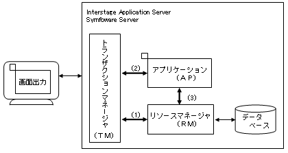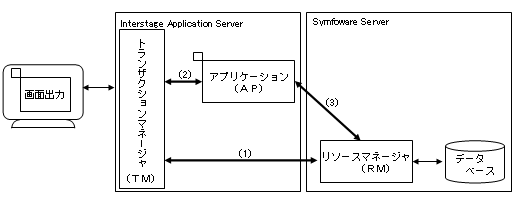 トランザクションモニタとSymfoware/RDBとの連携は、XAインタフェースを利用します。XAインタフェースは、トランザクションマネージャであるTPモニタ(Transaction Processing monitor)の製品と各種リソースマネージャ(Symfoware/RDBおよび各種RDBMS)とを連携します。