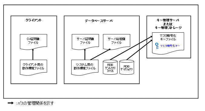 格納データを暗号化する場合は、キー管理サーバまたはキー管理ストレージを設け、そこにマスタ暗号化キーファイルを配置します。