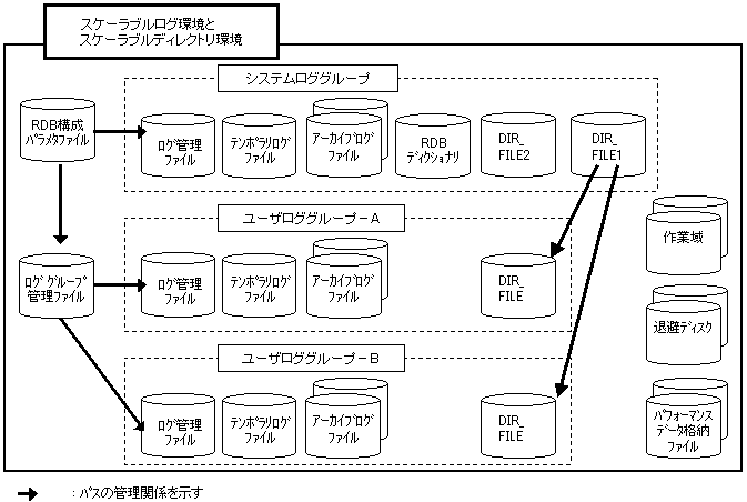 スケーラブルログ環境は、1つのシステムロググループおよびユーザが追加定義した複数のユーザロググループから成り、合わせて最大100個のロググループが定義できます。
