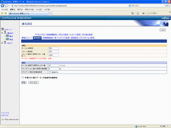 左フレームの[RDBシステム名]、または、[RDBシステム名]の左のアイコン(プラス記号)をクリックして[構成]または[環境]をクリックすると、“図2.7 [RDBシステム設定]画面”が表示されます。
