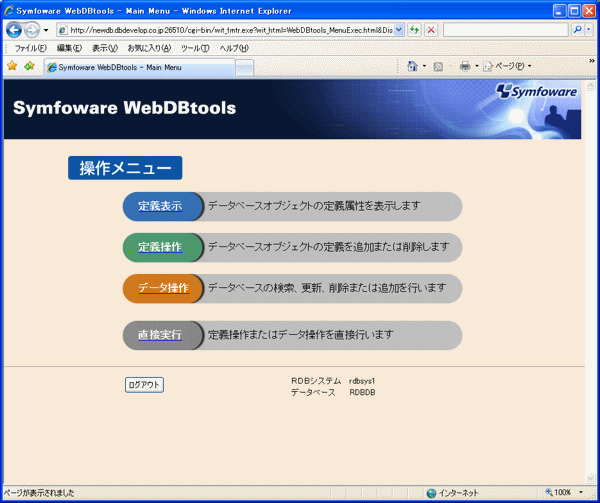 WebDBtoolsからSymfoware/RDBにログインすると、“図2.10 [機能選択]画面”が表示されます。