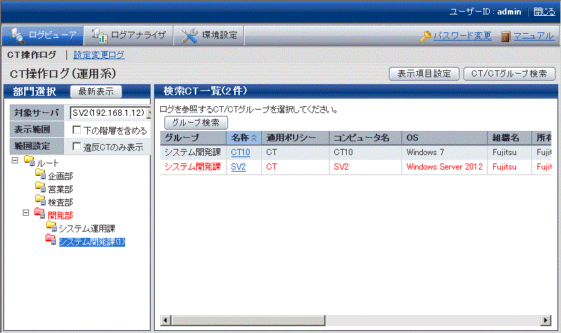 [部門選択]のCTグループツリーで、ログを参照するクライアント(CT)が所属するCTグループを選択します。