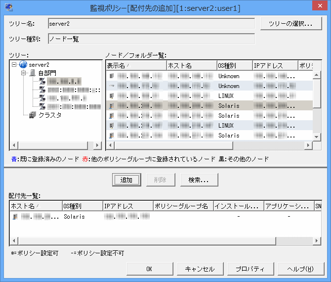 [監視ポリシー[配付先の追加]]画面の[ノード/フォルダ一覧]から追加したいノード、またはフォルダを選択し、[追加]ボタンをクリックします。